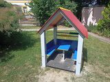 Băncile, pereții laterali și masa sunt realizate din plastic HDPE de înaltă calitate (polietilenă colorată de înaltă densitate, caracterizată printr-o stabilitate ridicată a culorii, rezistență la radiații UV, însă, în principal, siguranță, deoarece nu se sparge și nu există, astfel, pericolul de vătămare corporală a copiilor din cauza fragmentelor ascuțite). Acoperiș este realizați din HPL (Laminat de înaltă presiune, caracterizată printr-o stabilitate ridicată a culorii, rezistență la radiații UV, însă și rezistența la apă). Podeaua este realizați din HPL (Laminat de înaltă presiune, caracterizată printr-o stabilitate ridicată a culorii, însă și rezistența la apă). Toate materialele de fixare sunt galvanizate sau sunt realizate din oțel inoxidabil.