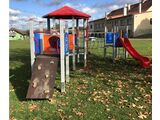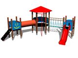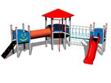 3 turnuri, tobogan, acoperiș, perete de cățărare înclinat, punte cu corzi, scară, tunel pentru mers de-a bușilea între turnuri, stâlp de pompieri, 6 bariere din HDPE. Mai multe informaţii