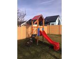 Turn, tobogan, acoperiș în formă de A, rampă înclinată cu trepte și mânere metalice, rampă înclinată cu frânghie și trepte HDPE, acces la plasa înclinată. Mai multe informaţii