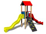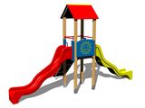 Turn, 2 tobogane, acoperiș în formă de A, rampă înclinată cu frânghie și trepte HDPE, bariere. Mai multe informaţii