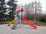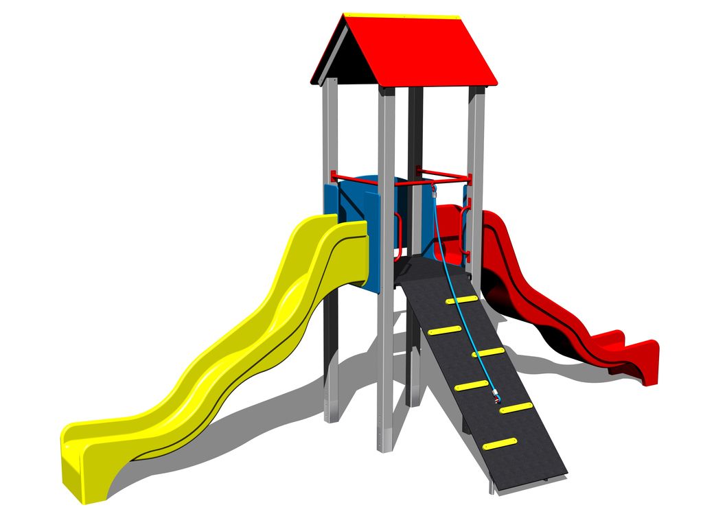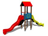 Turn, 2 tobogane, acoperiș în formă de A, rampă înclinată cu frânghie și trepte HDPE, bariere. Mai multe informaţii