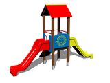 Turn, 2 tobogane, acoperiș în formă de A, rampă înclinată cu frânghie și trepte HDPE, bariere. Mai multe informaţii