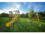 Scaunele și balamalele nu fac parte din leagăn. Este necesar să cumpărați un scaun (2 bucăți) la alegere și draperii (4 bucăți). 2 turnuri, tobogane, 3 bariere din HDPE, acces la plasă înclinată, perete de cățărare vertical, steag, 2 creneluri din HDPE, grinda metalica, pod de frânghie cu trepte. Mai multe informaţii