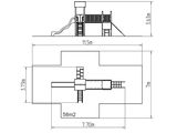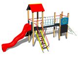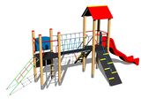 2 turnuri, acoperiș în formă de A, tobogan, rampă înclinată cu frânghie și trepte HDPE, scară, rampă înclinată cu trepte și mânere metalice, pod cu balustradă de frânghie, tablă de desenat, bariere din HDPE. Mai multe informaţii