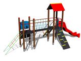 2 turnuri, acoperiș în formă de A, tobogan, rampă înclinată cu frânghie și trepte HDPE, scară, rampă înclinată cu trepte și mânere metalice, pod cu balustradă de frânghie, tablă de desenat, bariere din HDPE. Mai multe informaţii