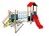 2 turnuri, tobogan, acoperiș în formă de A, rampă înclinată cu frânghie și trepte HDPE, punte cu corzi, rampă înclinată cu trepte și mânere metalice, perete de cățărare vertical, bariere din HDPE. Mai multe informaţii