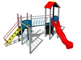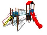 2 turnuri, tobogan, acoperiș în formă de A, rampă înclinată cu frânghie și trepte HDPE, punte cu corzi, rampă înclinată cu trepte și mânere metalice, perete de cățărare vertical, bariere din HDPE. Mai multe informaţii