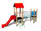 2 turnuri, tobogan, acoperiș în formă de A, bariere din HDPE, rampă înclinată cu frânghie și trepte HDPE, punte cu corzi, acces la plasa înclinată, scară. Mai multe informaţii