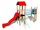 2 turnuri, tobogan, acoperiș în formă de A, bariere din HDPE, rampă înclinată cu frânghie și trepte HDPE, punte cu corzi, acces la plasa înclinată, scară. Mai multe informaţii