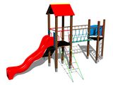 2 turnuri, tobogan, acoperiș în formă de A, bariere din HDPE, rampă înclinată cu frânghie și trepte HDPE, punte cu corzi, acces la plasa înclinată, scară. Mai multe informaţii