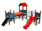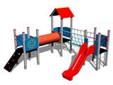 3 turnuri, tobogan, acoperiș în formă de A, perete de cățărare înclinat, punte cu corzi, scară, 5 bariere din HDPE, tunel pentru mers de-a bușilea între turnuri. Mai multe informaţii