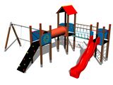 Toboganul este realizat din fibră de sticlă triplu stratificată. Suprafețele toboganelor, treptelor etc. sunt realizate din plastic HDPE de înaltă calitate (polietilenă colorată de înaltă densitate, caracterizată printr-o stabilitate ridicată a culorii, rezistență la radiații UV, însă, în principal, siguranță, deoarece nu se sparge și nu există, astfel, pericolul de vătămare corporală a copiilor din cauza fragmentelor ascuțite). Puntea cu corzi este realizată din material HERKULES (frânghii cu grosimea de 16 mm din polipropilenă cu miez interior din oțel) și este conectată cu îmbinări din plastic sau aluminiu. Platformele și peretele de cățărare înclinat sunt realizați din HPL (Laminat de înaltă presiune, caracterizată printr-o stabilitate ridicată a culorii însă și rezistența la apă). Suporturile de cățărare sunt realizate dintr-un amestec de nisip de silice și rășină epoxidică, care asigură o durată lungă de viață, păstrarea culorii, precum și o suprafață confortabilă la contactul cu pielea. Tunelul pentru mers de-a bușilea este realizat din material laminat cu stabilitate ridicată la radiații UV și cu stabilitate ridicată a culorilor. Acoperiș este realizați din HPL (Laminat de înaltă presiune, caracterizată printr-o stabilitate ridicată a culorii, rezistență la radiații UV, însă și rezistența la apă). Toate materialele de fixare sunt galvanizate sau sunt realizate din oțel inoxidabil.