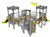 4 turnuri, 2 tobogane, 4 bariere din HDPE, acces la plasă înclinată, 2x punte cu corzi, perete de cățărare vertical, steag, 3 creneluri din HDPE, pod de frânghie cu trepte. Mai multe informaţii