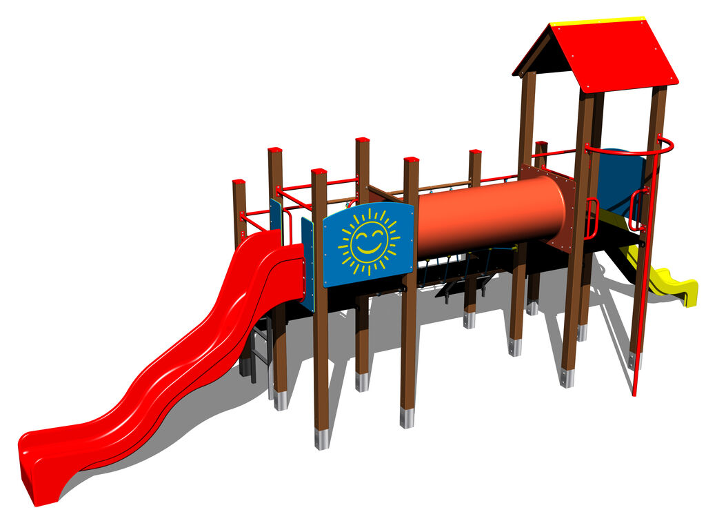 4 turnuri, 2 tobogane, perete de cățărare înclinat cu suporturi de cățărare, rampă înclinată cu frânghie și trepte HDPE, 2 bariere din HDPE, scară, acoperiș în formă de A, tunel pentru mers de-a bușilea între turnuri, stâlp de pompieri, pod cu balustradă de frânghie. Mai multe informaţii
