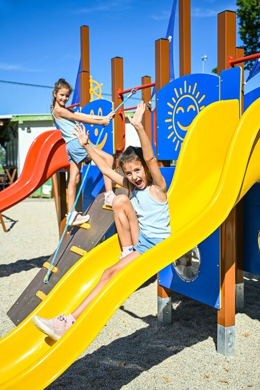 Toboganele sunt realizate din fibră de sticlă triplu stratificată. Suprafețele toboganelor, treptelor etc. sunt realizate din plastic HDPE de înaltă calitate (polietilenă colorată de înaltă densitate, caracterizată printr-o stabilitate ridicată a culorii, rezistență la radiații UV, însă, în principal, siguranță, deoarece nu se sparge și nu există, astfel, pericolul de vătămare corporală a copiilor din cauza fragmentelor ascuțite). Plasa de cățărare și frânghia sunt realizate din material HERKULES (frânghii cu grosimea de 16 mm din polipropilenă cu miez interior din oțel) și sunt conectate cu îmbinări din plastic sau aluminiu. Platformele, rampa, tabla de desenat și peretele de cățărare înclinat sunt realizați din HPL (Laminat de înaltă presiune, caracterizată printr-o stabilitate ridicată a culorii însă și rezistența la apă). Suporturile de cățărare sunt realizate dintr-un amestec de nisip de silice și rășină epoxidică, care asigură o durată lungă de viață, păstrarea culorii, precum și o suprafață confortabilă la contactul cu pielea. Toate materialele de fixare sunt galvanizate sau sunt realizate din oțel inoxidabil.