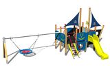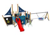 6 turnuri, 2 tobogane, 2 seturi de bare metalice într-un cadru din lemn, 2 stâlpi cu steag, acces la plasa înclinată, timonă din HDPE, 4 bariere din HDPE, 2 bariere cu o deschidere, rampă înclinată cu trepte și mânere metalice, tablă de desenat cu o ancoră, leagăn cu lanț. Mai multe informaţii