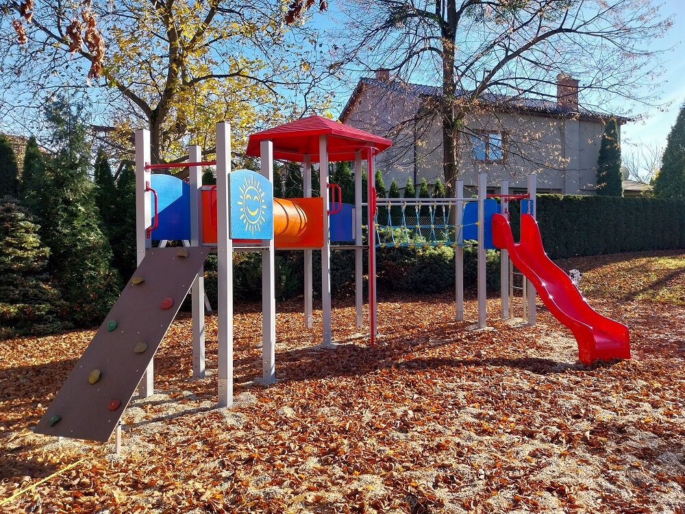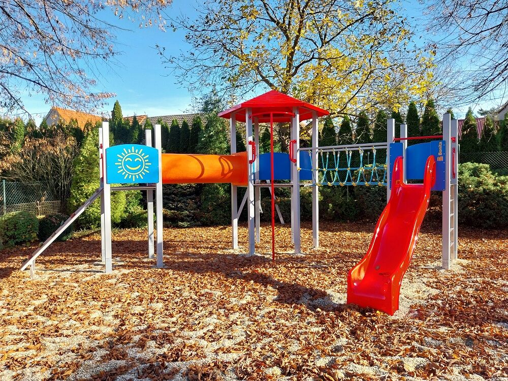 3 turnuri, tobogan, acoperiș, perete de cățărare înclinat, punte cu corzi, scară, tunel pentru mers de-a bușilea între turnuri, stâlp de pompieri, 6 bariere din HDPE. Mai multe informaţii