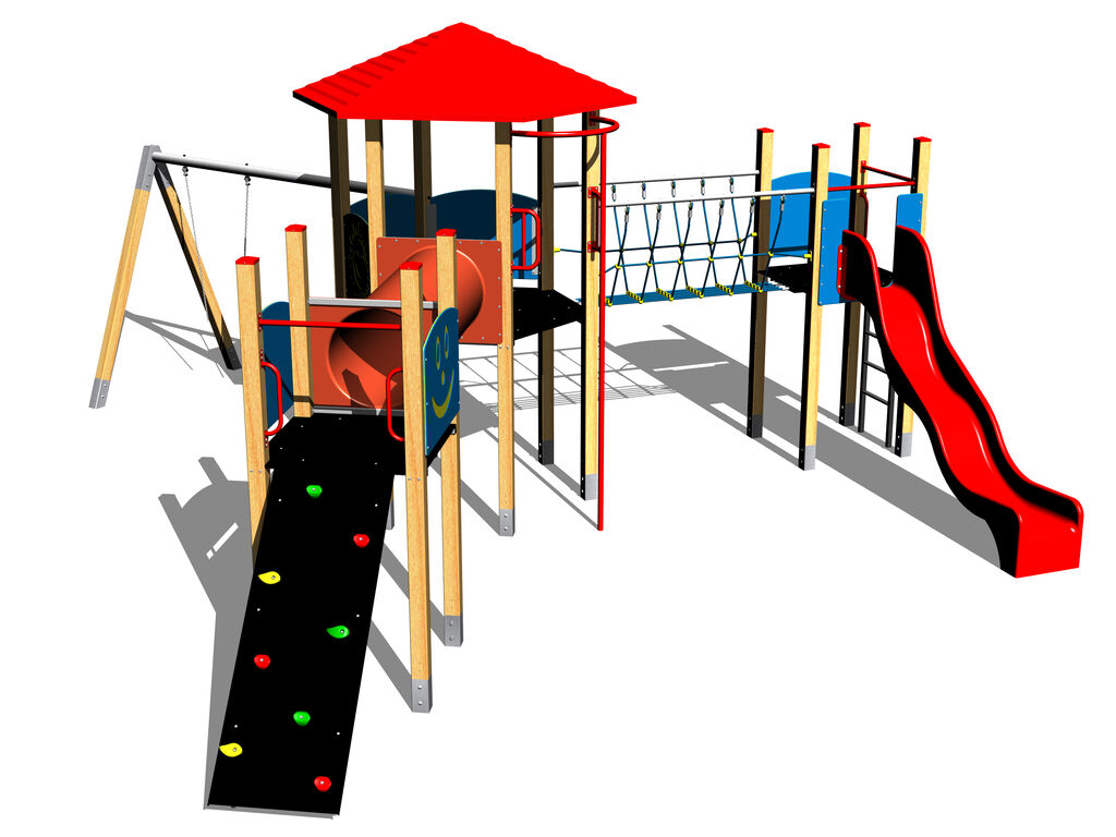 Structura de susținere a unității cu turn este realizată cu suporturi din lemn groase, lipite. Această soluție asigură o protecție maximă împotriva fisurării, problemă comună la produsele realizate din lemn masiv. Suporturile din lemn sunt impregnate și acoperite cu un strat triplu de lac, care respectă termenii și condițiile standardului EN71/3 (sigur pentru jucăriile copiilor). Structurile sunt ancorate în sol cu plăci din oțel care sunt protejate împotriva coroziunii prin galvanizare la cald și sunt fixate într-o fundație de beton. Ancorele sunt fixate pe unitatea de joacă cu şuruburi, iar structura lor garantează că nu intră în contact direct cu solul. Toate celelalte elemente metalice sunt, de asemenea, zincate sau acoperite cu duplex strat de vopsea pe bază de pulberi întărite în conformitate cu RAL, pentru a preveni coroziunea. Toboganul este realizat din fibră de sticlă triplu stratificată. Suprafețele toboganelor, treptelor etc. sunt realizate din plastic HDPE de înaltă calitate (polietilenă colorată de înaltă densitate, caracterizată printr-o stabilitate ridicată a culorii, rezistență la radiații UV, însă, în principal, siguranță, deoarece nu se sparge și nu există, astfel, pericolul de vătămare corporală a copiilor din cauza fragmentelor ascuțite). Puntea cu corzi este realizată din material HERKULES (frânghii cu grosimea de 16 mm din polipropilenă cu miez interior din oțel) și este conectată cu îmbinări din plastic sau aluminiu. Platformele și peretele de cățărare înclinat sunt realizați din HPL (Laminat de înaltă presiune, caracterizată printr-o stabilitate ridicată a culorii însă și rezistența la apă). Suporturile de cățărare sunt realizate dintr-un amestec de nisip de silice și rășină epoxidică, care asigură o durată lungă de viață, păstrarea culorii, precum și o suprafață confortabilă la contactul cu pielea. Tunelul pentru mers de-a bușilea este realizat din material laminat. Toate materialele de fixare sunt galvanizate sau sunt realizate din oțel inoxidabil.
