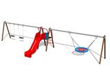 Leagăn cu trei locuri cu tobogan RH6381K - cu o platformă de aterizare și un braț metalic, galvanizat, înălțime de cădere 1 m, gazonul este suficient pentru suprafața de impact. 1 scaun „scoică” (diametru 1 m), 2 Scaunul normal. Sunt disponibile patru variante de culori - roșu, verde, albastru și galben. Mai multe informaţii