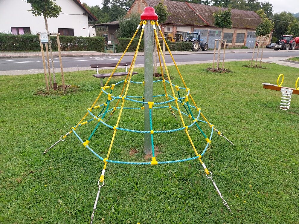 Stâlpul de susținere al piramidei din frânghii este realizat din oțel structural. Stâlpul este protejat împotriva coroziunii prin galvanizare la cald și este fixat într-o fundație de beton. Frânghiile sunt realizate din material HERKULES (frânghii cu grosimea de 16 mm din polipropilenă cu miez interior din oțel) și sunt conectate cu îmbinări din plastic sau aluminiu. Piulițele de strângere sunt din oțel inoxidabil. Toate materialele de fixare sunt galvanizate sau sunt realizate din oțel inoxidabil.