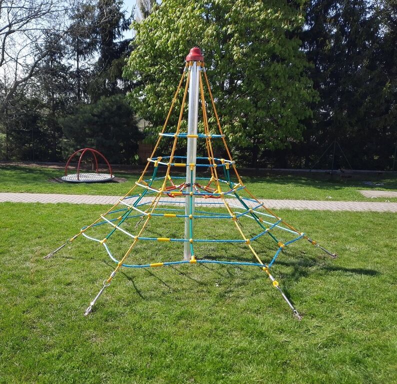 Stâlpul de susținere al piramidei din frânghii este realizat din oțel structural. Stâlpul este protejat împotriva coroziunii prin galvanizare la cald și este fixat într-o fundație de beton. Frânghiile sunt realizate din material HERKULES (frânghii cu grosimea de 16 mm din polipropilenă cu miez interior din oțel) și sunt conectate cu îmbinări din plastic sau aluminiu. Piulițele de strângere sunt din oțel inoxidabil. Toate materialele de fixare sunt galvanizate sau sunt realizate din oțel inoxidabil.