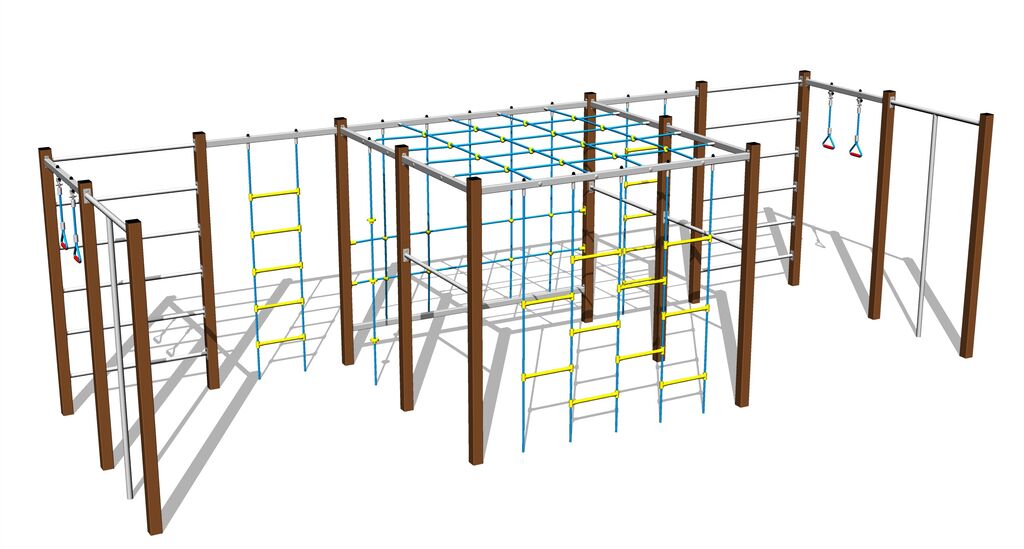 Plasa de cățărare, orizontală, sfoara de cățărare și scara cu frânghii sunt realizate din material HERKULES (frânghii cu grosimea de 16 mm din polipropilenă cu miez interior din oțel) și sunt conectate cu îmbinări din plastic. Frânghiile sunt conectate cu îmbinări din plastic. Toate materialele de fixare sunt galvanizate sau sunt realizate din oțel inoxidabil.
