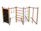 Plasa de cățărare și buclele frânghiilor de legănare sunt realizate din material HERKULES (frânghii cu grosimea de 16 mm din polipropilenă cu miez interior din oțel) și sunt conectate cu îmbinări din plastic. Peretele de cățărare este realizat din placaj impermeabil, proiectat pentru utilizare la exterior. Suporturile de cățărare sunt realizate dintr-un amestec de nisip de silice și rășină epoxidică, care asigură o durată lungă de viață, păstrarea culorii, precum și o suprafață confortabilă la contactul cu pielea. Toate materialele de fixare sunt galvanizate sau sunt realizate din oțel inoxidabil.