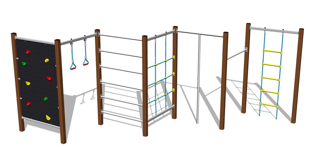 Plasa de cățărare și buclele frânghiilor de legănare sunt realizate din material HERKULES (frânghii cu grosimea de 16 mm din polipropilenă cu miez interior din oțel) și sunt conectate cu îmbinări din plastic. Peretele de cățărare este realizată din HPL (Laminat de înaltă presiune, caracterizată printr-o stabilitate ridicată a culorii însă și rezistența la apă). Suporturile de cățărare sunt realizate din poliester, care asigură o durată lungă de viață, păstrarea culorii, precum și o suprafață confortabilă la contactul cu pielea. Toate materialele de fixare sunt galvanizate sau sunt realizate din oțel inoxidabil.
