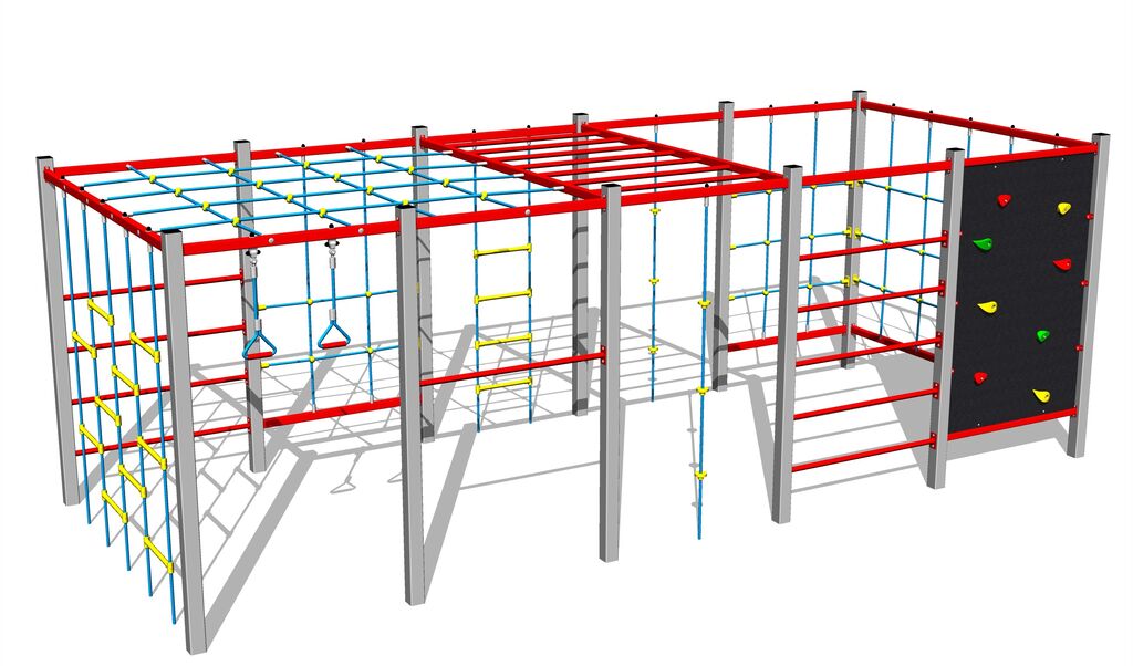 Plasa de cățărare, orizontală, sfoara de cățărare și scara cu frânghii sunt realizate din material HERKULES (frânghii cu grosimea de 16 mm din polipropilenă cu miez interior din oțel) și sunt conectate cu îmbinări din plastic. Peretele de cățărare este realizată din HPL (Laminat de înaltă presiune, caracterizată printr-o stabilitate ridicată a culorii însă și rezistența la apă). Suporturile de cățărare sunt realizate din poliester, care asigură o durată lungă de viață, păstrarea culorii, precum și o suprafață confortabilă la contactul cu pielea. Toate materialele de fixare sunt galvanizate sau sunt realizate din oțel inoxidabil.