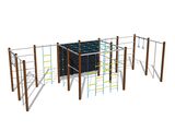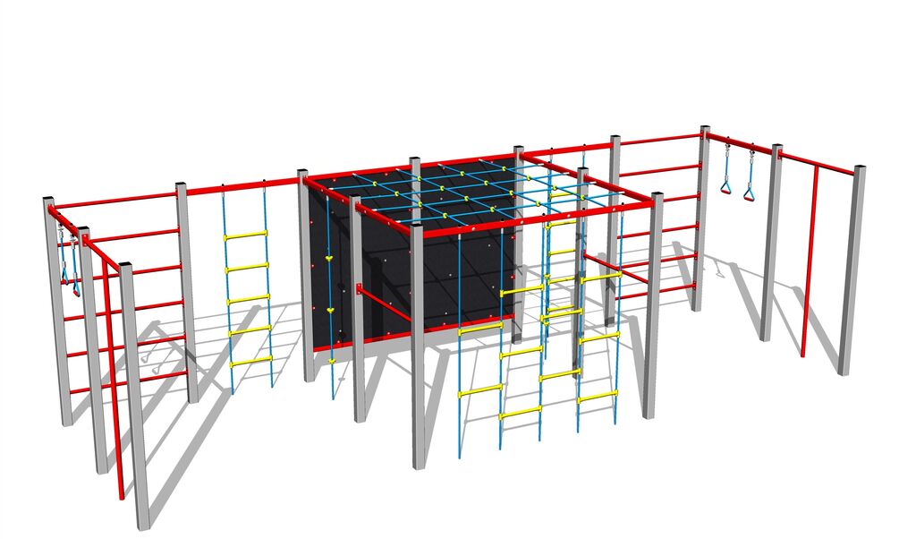 Perete de cățărare, scară suedeză, 2 sfori de cățărare, 2 stâlpi de cățărare, plasă de cățărare, scară cu frânghii, plasă de cățărare orizontală.