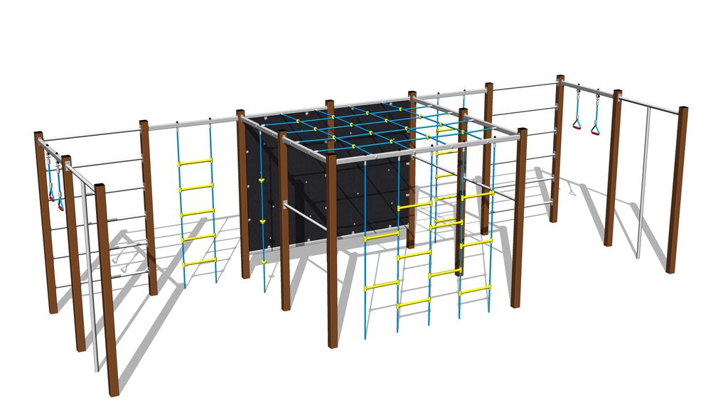 Plasa de cățărare, orizontală, sfoara de cățărare și scara cu frânghii sunt realizate din material HERKULES (frânghii cu grosimea de 16 mm din polipropilenă cu miez interior din oțel) și sunt conectate cu îmbinări din plastic. Peretele de cățărare este realizată din HPL (Laminat de înaltă presiune, caracterizată printr-o stabilitate ridicată a culorii însă și rezistența la apă). Suporturile de cățărare sunt realizate din poliester, care asigură o durată lungă de viață, păstrarea culorii, precum și o suprafață confortabilă la contactul cu pielea. Toate materialele de fixare sunt galvanizate sau sunt realizate din oțel inoxidabil.