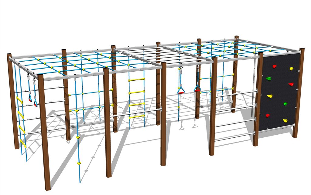 Perete de cățărare, scară suedeză, 2 sfori de cățărare, 2 stâlpi de cățărare, plasă de cățărare, scară cu frânghii, plasă de cățărare orizontală.