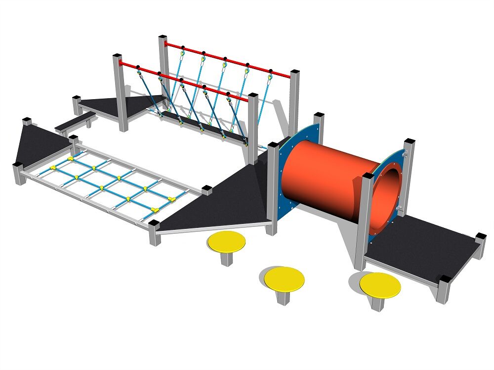Structura de susținere a treptelor este realizată din oțel structural, care este protejat împotriva coroziunii prin zincare, ceea ce conduce la o durată lungă de viață a elementelor pentru antrenament sau acoperite cu duplex strat de vopsea pe bază de pulberi întărite în conformitate cu RAL, pentru a preveni coroziunea. Aceste structuri sunt încorporate într-o bază de beton. Toate celelalte elemente metalice sunt, de asemenea, zincate sau acoperite cu duplex strat de vopsea pe bază de pulberi întărite în conformitate cu RAL, pentru a preveni coroziunea. Frânghiile și plasele sunt realizate din material HERKULES (frânghii de polipropilenă de 16 mm cu miez interior din oțel) și sunt conectate cu conectori din plastic. Tunelul pentru mers de-a bușilea este realizat din polietilenă cu stabilitate ridicată la radiații UV și cu stabilitate ridicată a culorilor. Platformele sunt realizați din HPL (Laminat de înaltă presiune, caracterizată printr-o stabilitate ridicată a culorii însă și rezistența la apă). Toate materialele de conectare sunt acoperite cu un strat de zinc sau oțel inoxidabil.