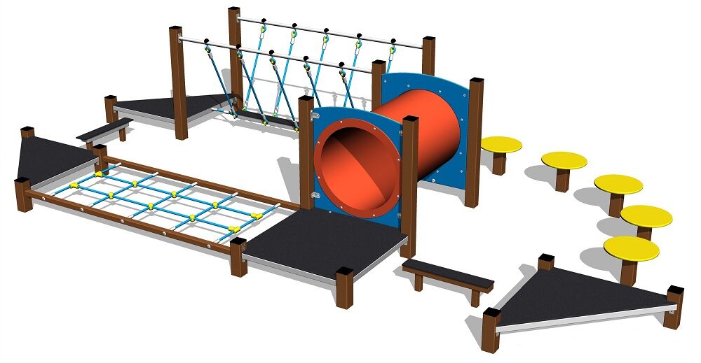 Structura de susținere a treptelor este realizată din oțel structural, care este protejat împotriva coroziunii prin zincare, ceea ce conduce la o durată lungă de viață a elementelor pentru antrenament sau acoperite cu duplex strat de vopsea pe bază de pulberi întărite în conformitate cu RAL, pentru a preveni coroziunea. Aceste structuri sunt încorporate într-o bază de beton. Toate celelalte elemente metalice sunt, de asemenea, zincate sau acoperite cu duplex strat de vopsea pe bază de pulberi întărite în conformitate cu RAL, pentru a preveni coroziunea. Frânghiile și plasele sunt realizate din material HERKULES (frânghii de polipropilenă de 16 mm cu miez interior din oțel) și sunt conectate cu conectori din plastic. Tunelul pentru mers de-a bușilea este realizat din polietilenă cu stabilitate ridicată la radiații UV și cu stabilitate ridicată a culorilor. Toate panourile treptelor sunt realizate din plastic HDPE de înaltă calitate (polietilenă complet colorată, de înaltă densitate, caracterizată printr-o stabilitate ridicată a culorii, rezistență la radiații UV, însă, în principal, siguranță, deoarece nu se sparge și nu există, astfel, pericolul de vătămare corporală din cauza fragmentelor sparte ascuțite). Platformele sunt realizați din HPL (Laminat de înaltă presiune, caracterizată printr-o stabilitate ridicată a culorii însă și rezistența la apă). Toate materialele de conectare sunt acoperite cu un strat de zinc sau oțel inoxidabil.