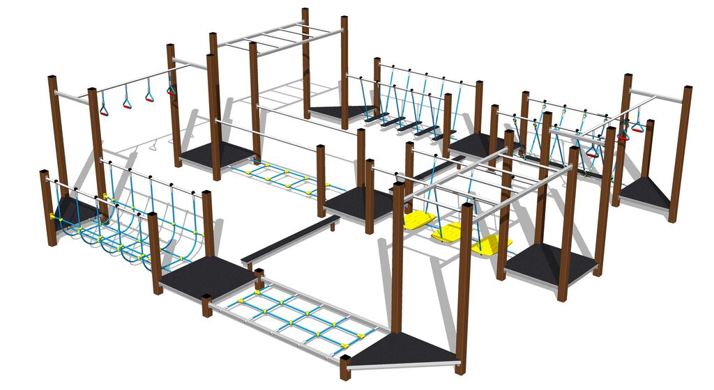 Traseul îndemânării SD8020K - nu este necesară o zonă de cădere până la înălțimea de 1 m, o suprafață cu iarbă este suficientă. Oferim două variante de culoare ale structurii de susținere - maro și argintiu.