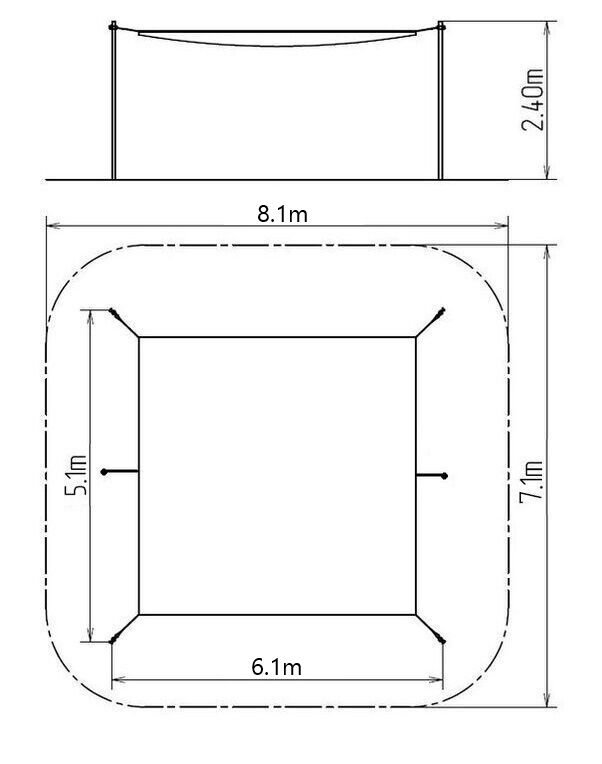 Structura de susținere a copertinei pentru groapa cu nisip este realizată din plasă de poliester cu înveliș cauciucat, care este rezistentă la radiații UV. Această construcție este încorporată într-o fundație de beton. Copertina pentru groapa cu nisip este realizată din tricot (țesătură de protecție rezistentă și durabilă, de înaltă calitate). Copertina pentru groapa cu nisip este permeabilă la apă. Toate elementele de fixare sunt galvanizate sau sunt realizate din oțel inoxidabil.